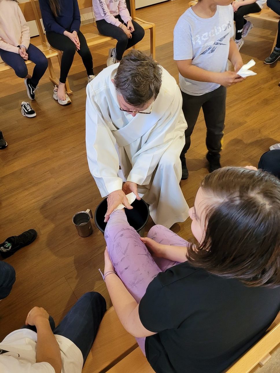 Le jeudi 14 avril, jeudi saint, les élèves qui préparent leur première communion se sont rappelés les évènements vécus par Jésus, à savoir le geste du lavement des pieds et le dernier repas avec ses apôtres. En effet, le jeudi saint nous nous rappelons que le geste du lavement des pieds est un message pour nous aussi aujourd’hui, un exemple à suivre  pour être au service des autres. Le dernier repas, où Jésus partage le pain et le vin est devenu le sacrement de l’Eucharistie. Nicolas Roux, diacre de notre diocèse, a célébré ce temps de rencontre et de prière. Les douze enfants qui ont participé au lavement des pieds étaient bien sûr impressionnés et intimidés mais tous très attentifs. Le « repas » a été symbolisé par un goûter.