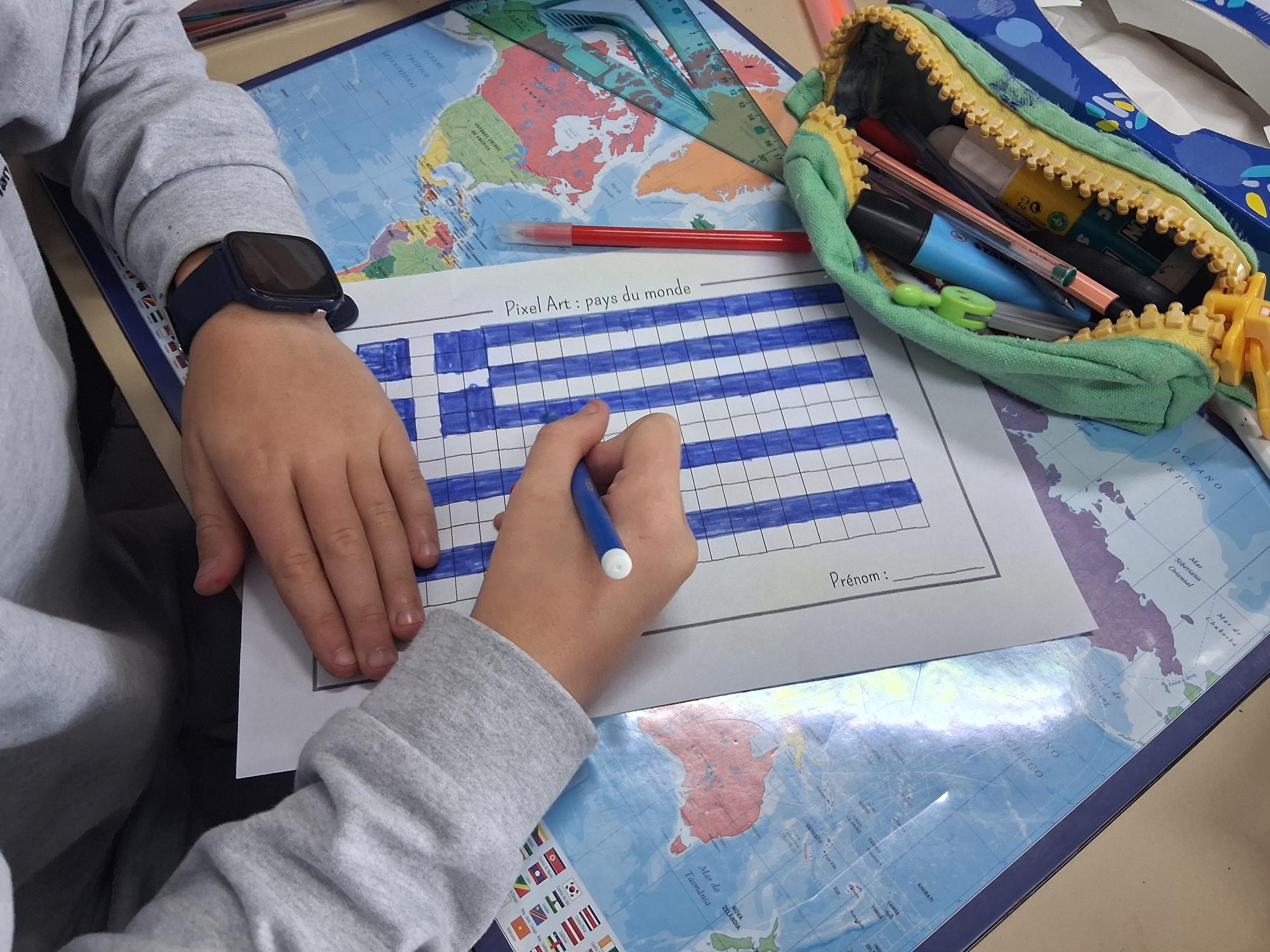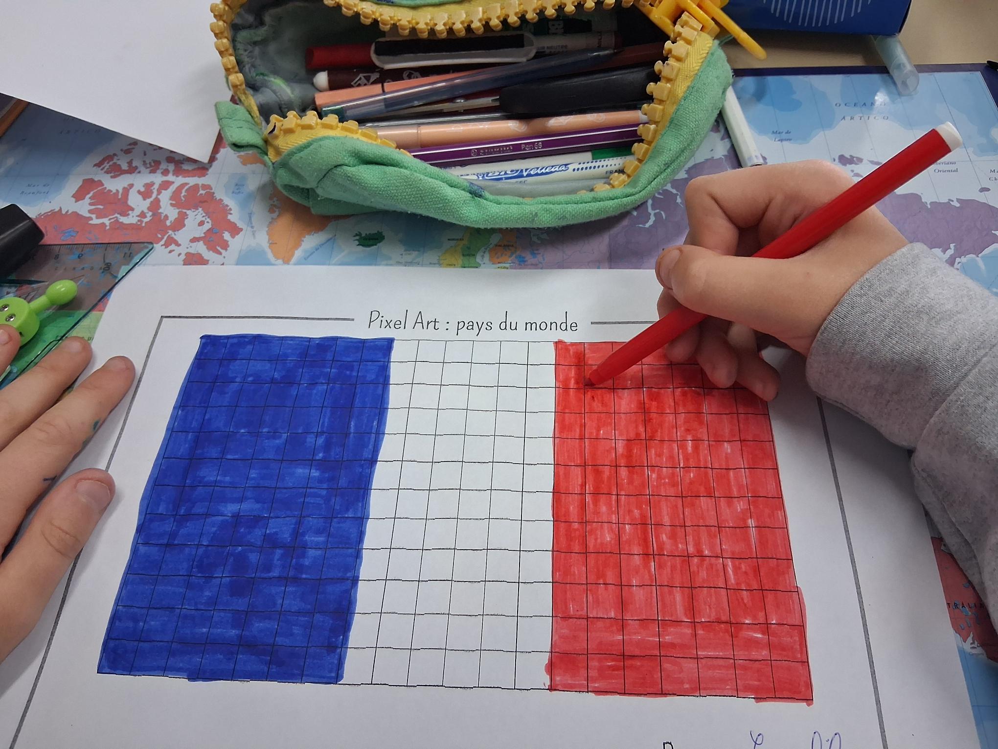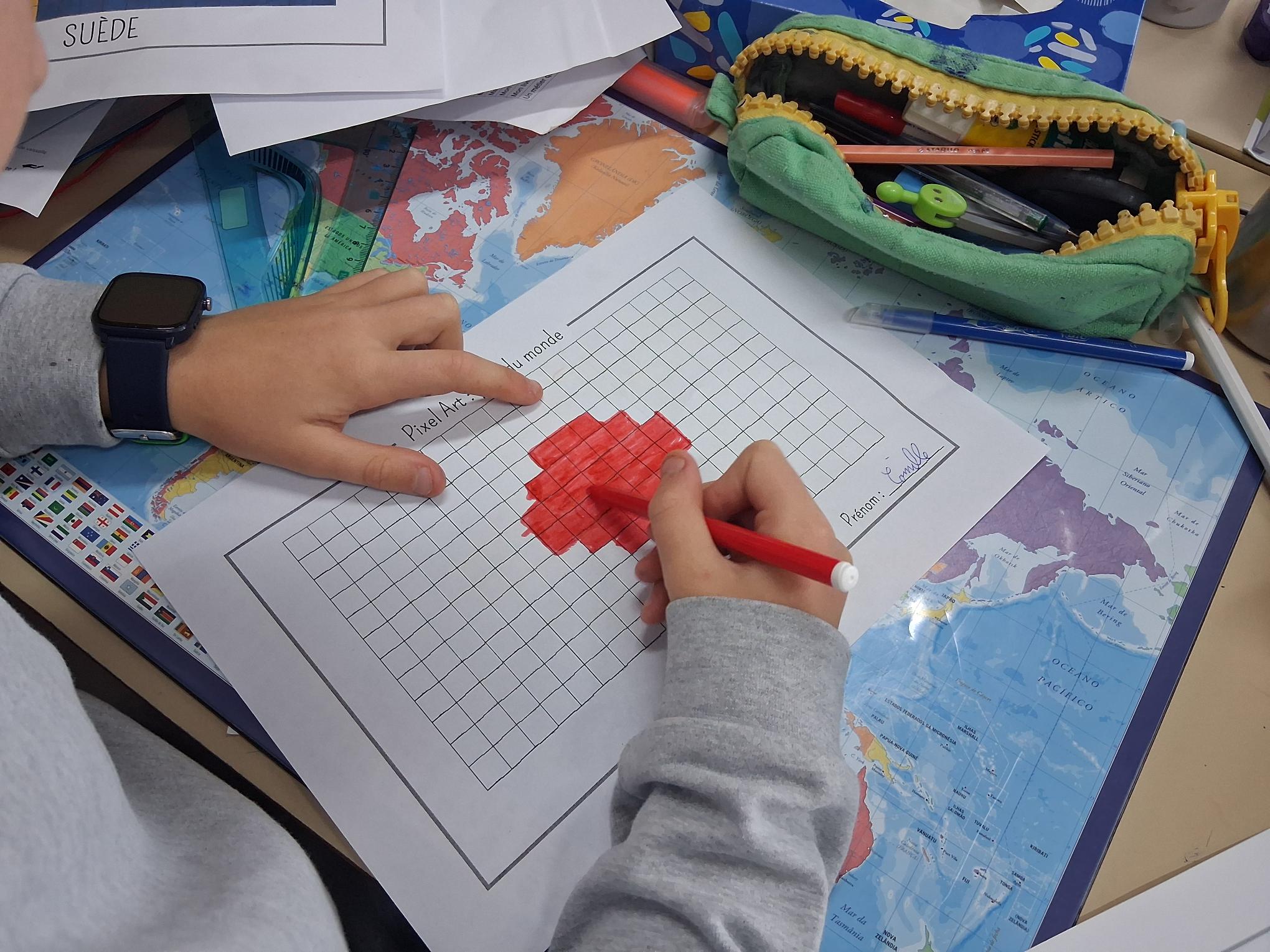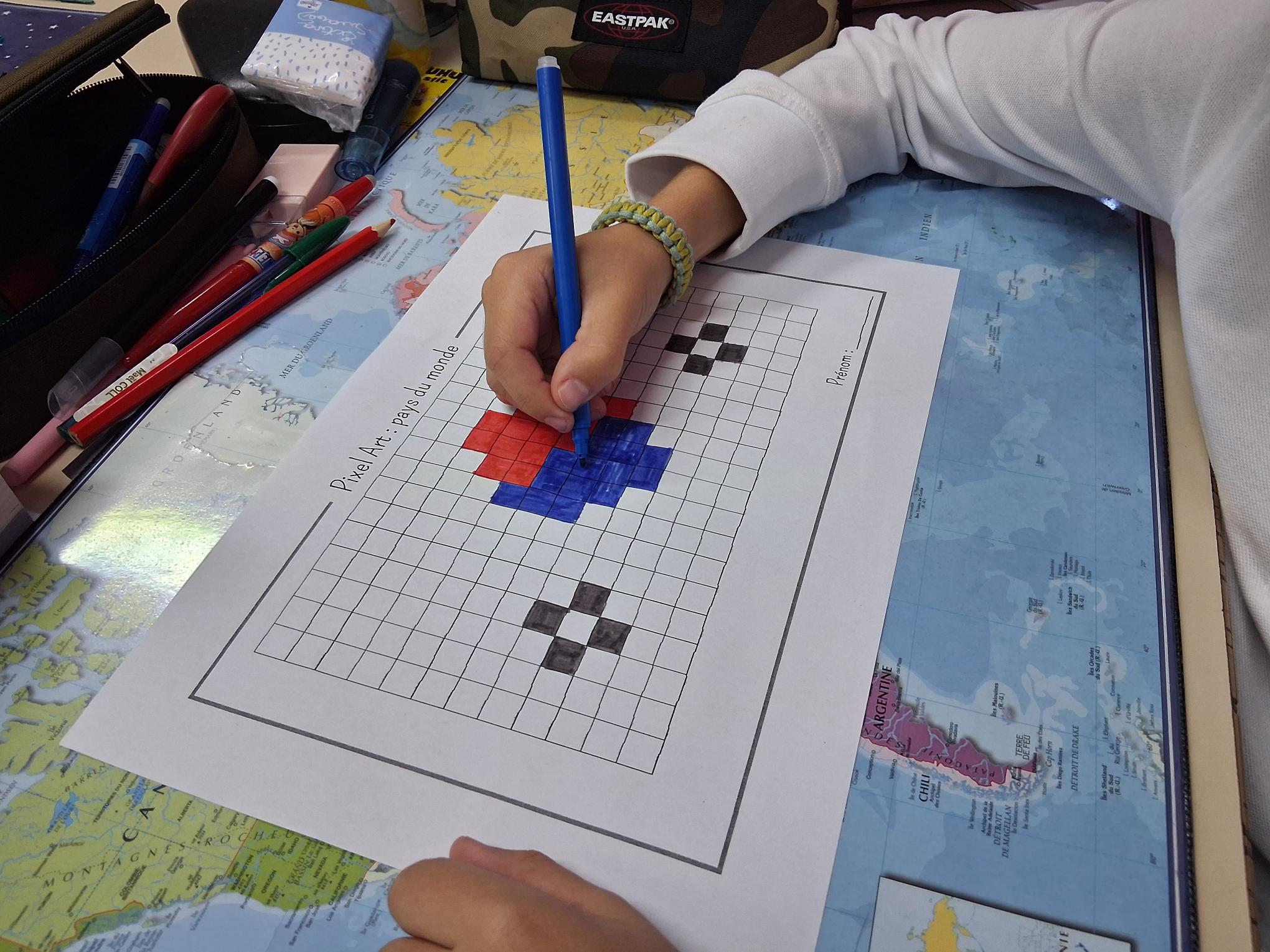 Les élèves de CM1 et CM2 ont été initiés à l’art du pixel en réalisant des œuvres sur le thème « Autour du monde », durant la pause méridienne. Les élèves ont pu approfondir les compétences suivantes : développer la créativité et l’expression artistique, améliorer la motricité fine et la coordination œil – main, se repérer et se déplacer sur un quadrillage, dénombrer, apprendre à planifier et à exécuter un projet artistique.
