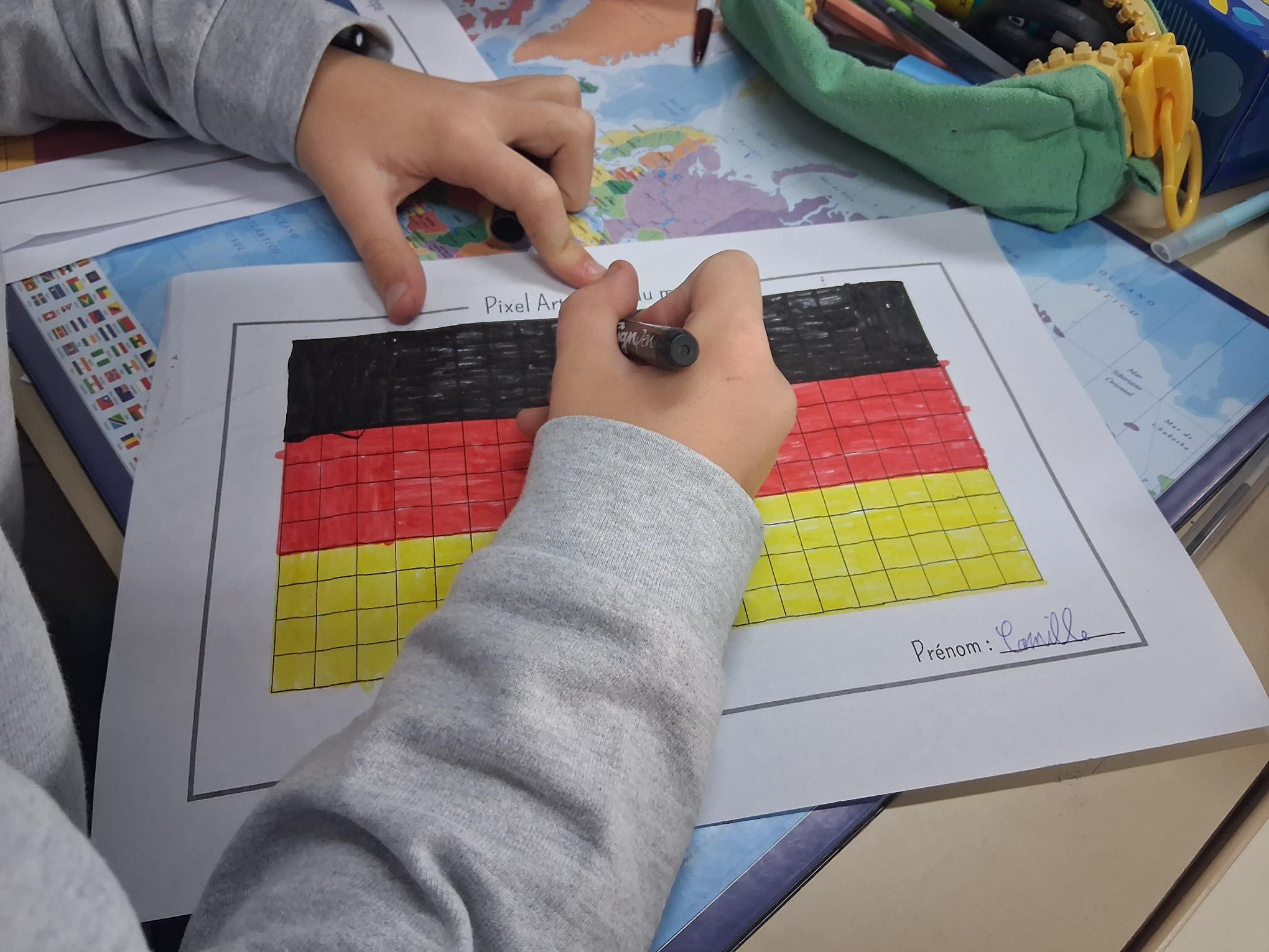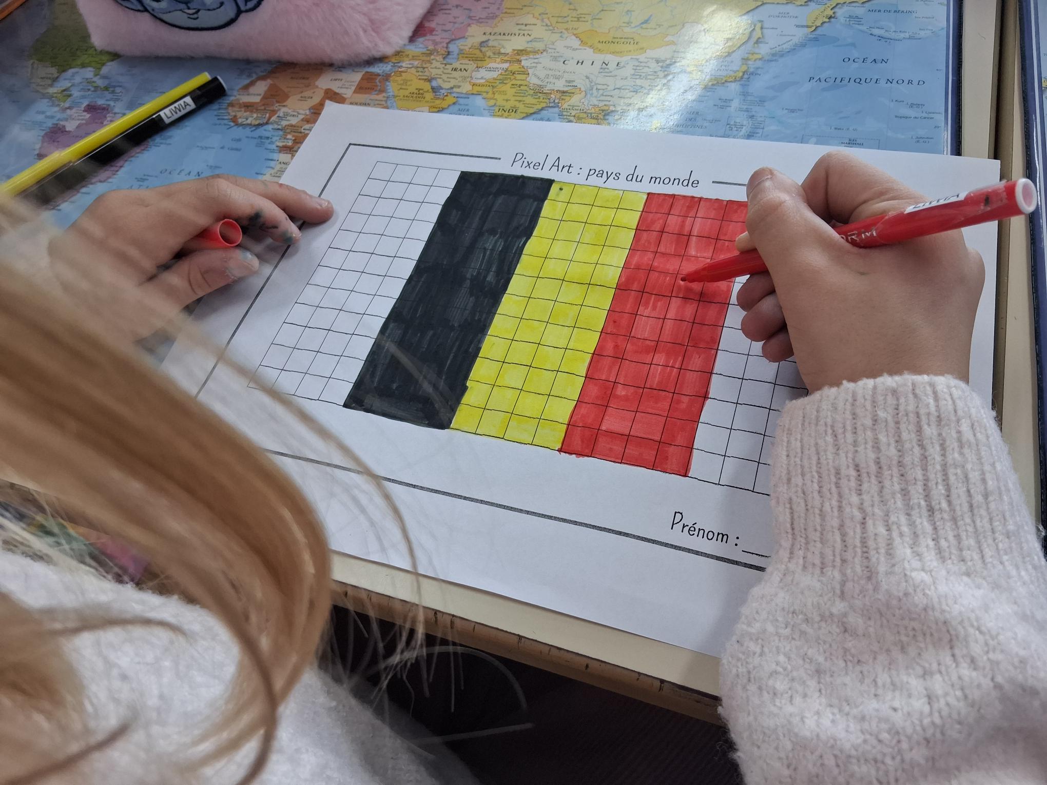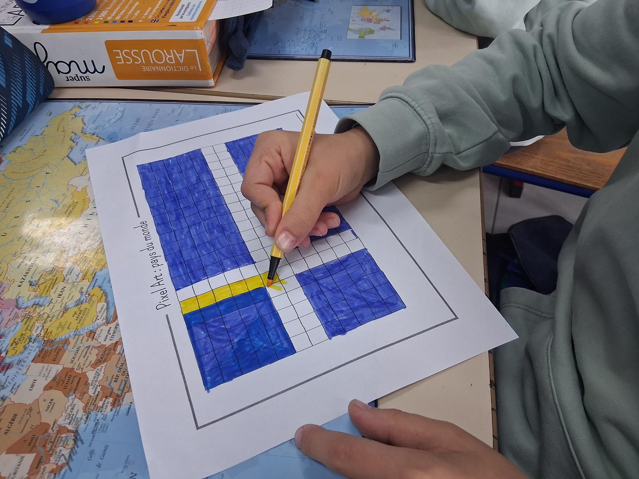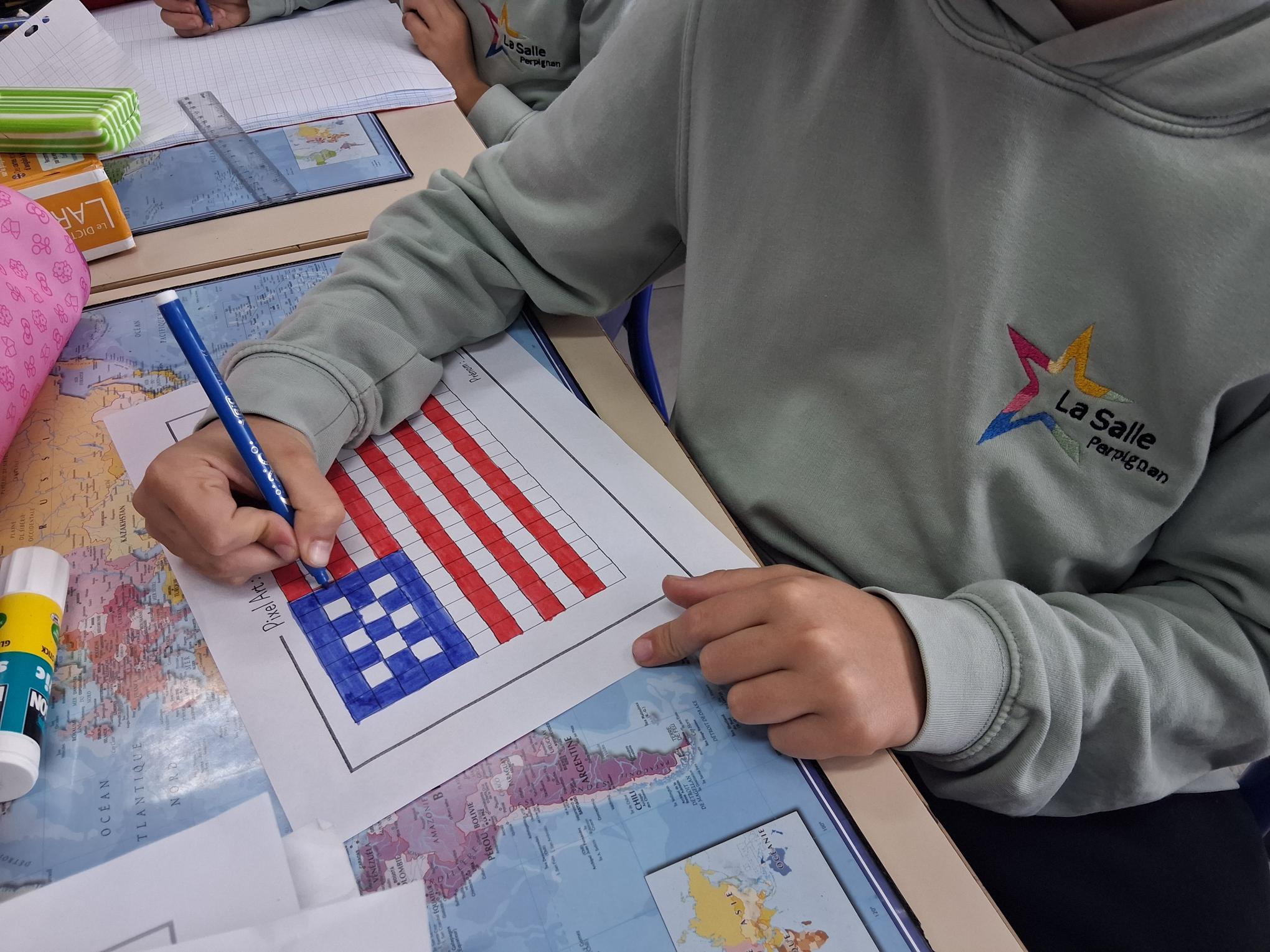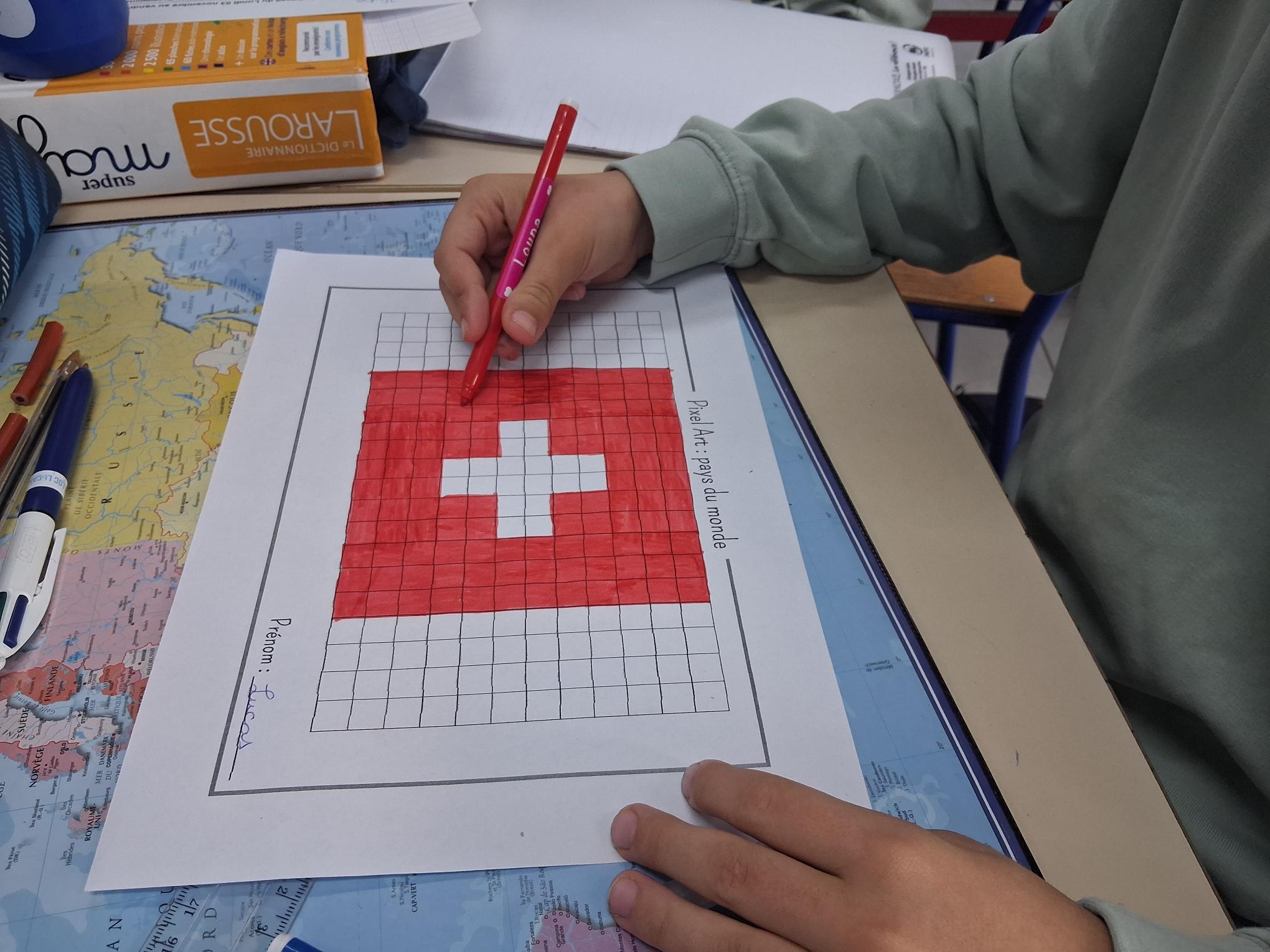 Les élèves de CM1 et CM2 ont été initiés à l’art du pixel en réalisant des œuvres sur le thème « Autour du monde », durant la pause méridienne. Les élèves ont pu approfondir les compétences suivantes : développer la créativité et l’expression artistique, améliorer la motricité fine et la coordination œil – main, se repérer et se déplacer sur un quadrillage, dénombrer, apprendre à planifier et à exécuter un projet artistique.